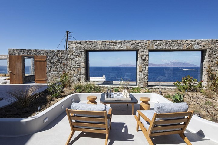 Nestled at the entrance of the villa and surrounded by the garden, the Garden Guest House offers a private and tranquil retreat with charming views over the island of Tinos and Mykonos port. Designed for guests who value both independence and comfort, this space invites quiet moments of relaxation—whether enjoying a game of chess on the outdoor oversized marble chess set or settling into a book in the generous, comfortable lounge chairs.