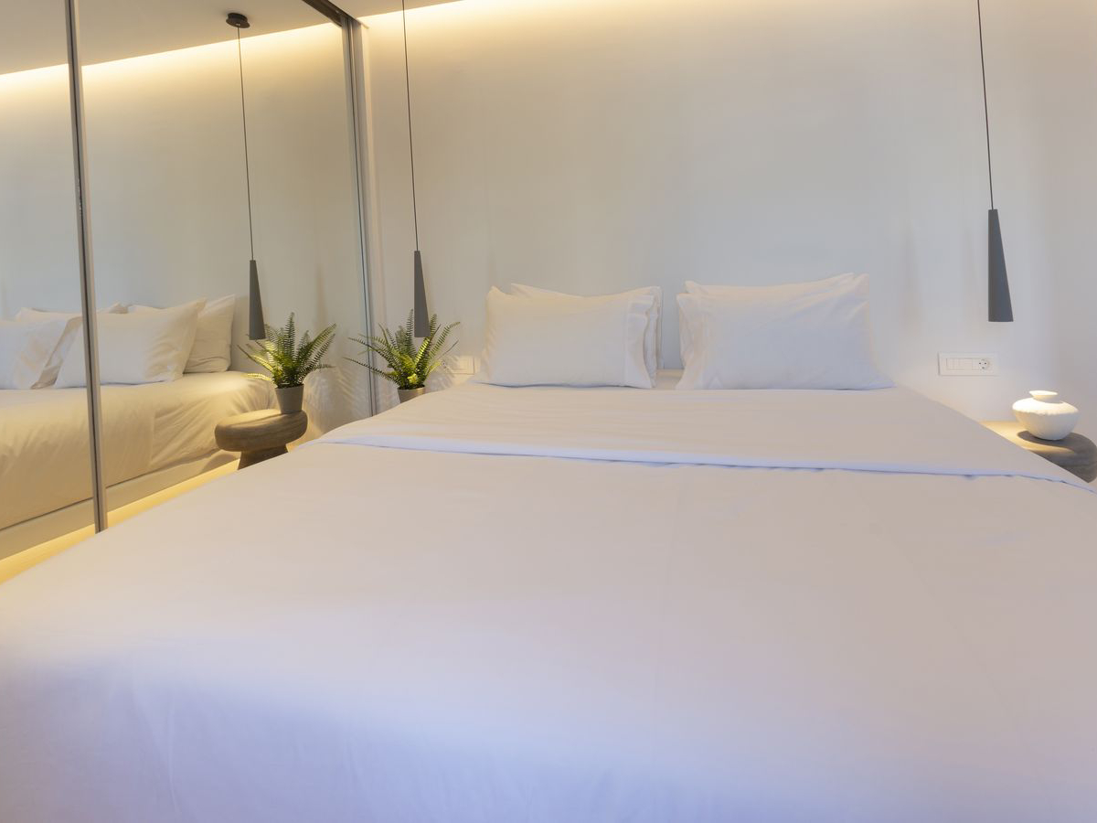 Nestled at the entrance of the villa and surrounded by the garden, the Garden Guest House offers a private and tranquil retreat with charming views over the island of Tinos and Mykonos port. Designed for guests who value both independence and comfort, this space invites quiet moments of relaxation—whether enjoying a game of chess on the outdoor oversized marble chess set or settling into a book in the generous, comfortable lounge chairs.